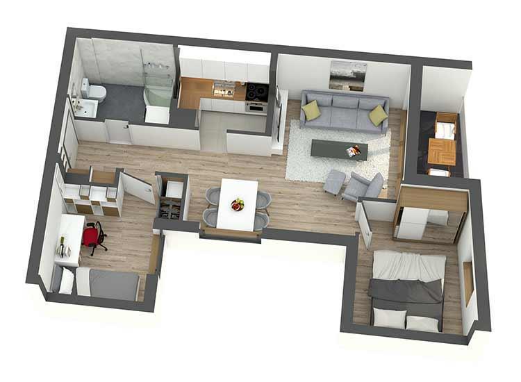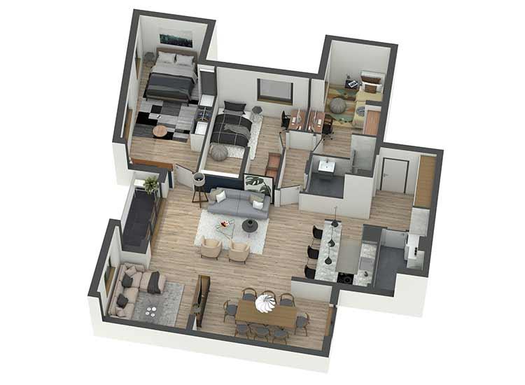 Pažljivo projektovani stanovi imaju odličnu iskorišćenost prostora, bez nepotrebnih hodnika, sa maksimalnim brojem soba u odnosu na ukupnu kvadraturu stana. Prostorije su pravilnih formi, površina srazmernih nameni kao i među sobom, gde veći broj spavaćih soba prati i veći dnevni prostor. Dnevne prostorije suobjedinjene u jednu celinu, bez zidova. Iz dnevnog prostora se pristupa tarasi. Objekat ima mali broj stanova, ali različitih struktura i kvadrature, tako da kupac može datu ponudu uskladiti prema svojim željama i mogućnostima. Po strukturi su stanovi pretežno dvoiposobni i troiposobni, od 40-90m².