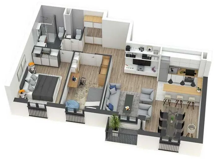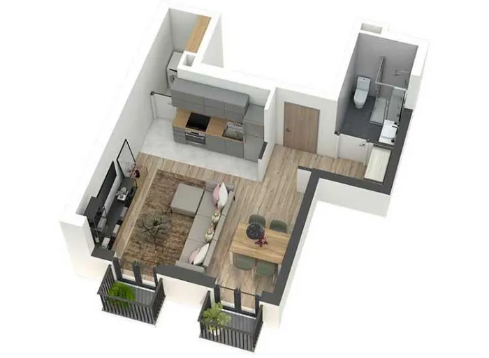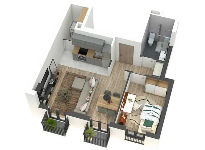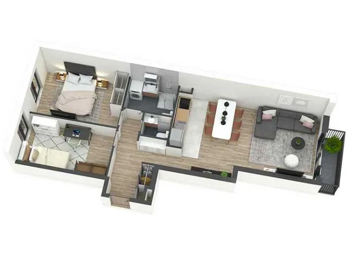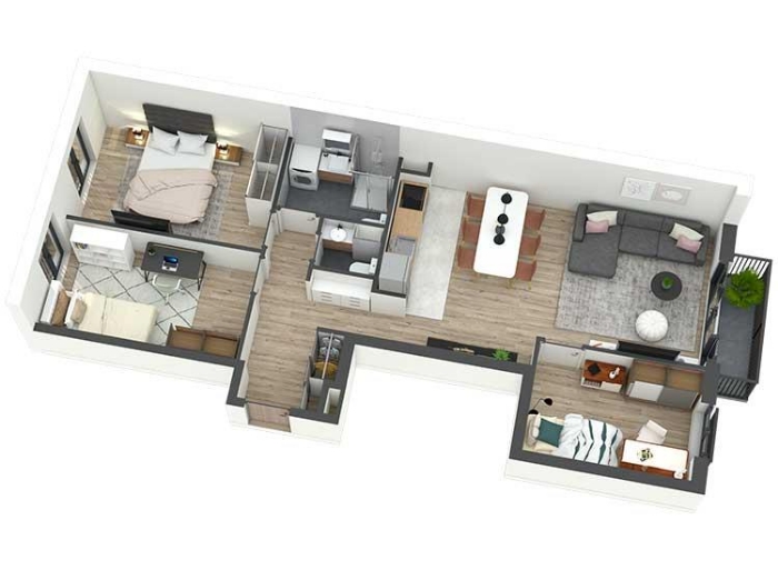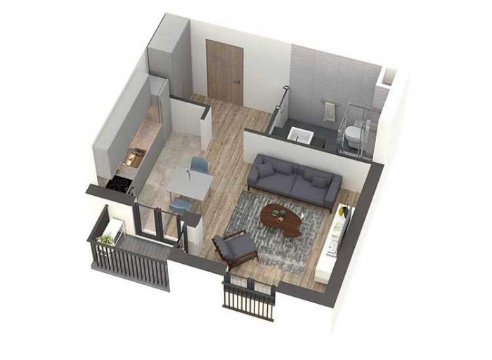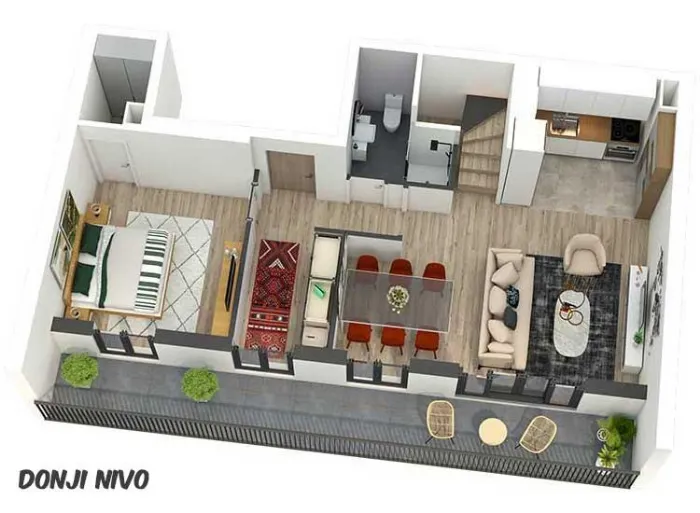 Pažljivo projektovani stanovi imaju odličnu iskorišćenost prostora, bez nepotrebnih hodnika, sa maksimalnim brojem soba u odnosu na ukupnu kvadraturu stana. Prostorije su pravilnih formi, površina srazmernih nameni kao i među sobom, gde veći broj spavaćih soba prati i veći dnevni prostor. Dnevne prostorije suobjedinjene u jednu celinu, bez zidova. Iz dnevnog prostora se pristupa tarasi.