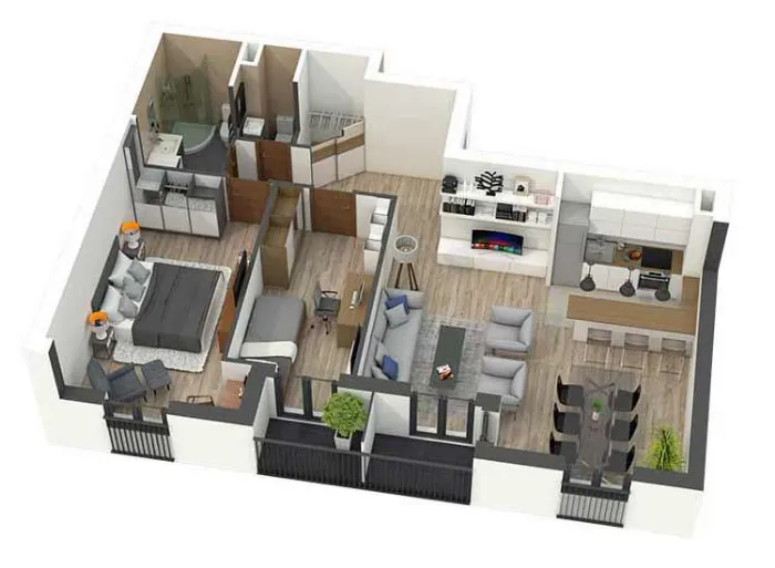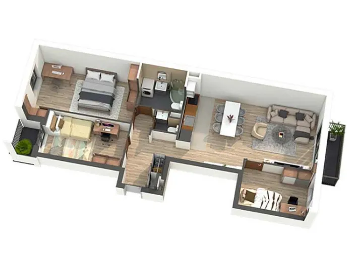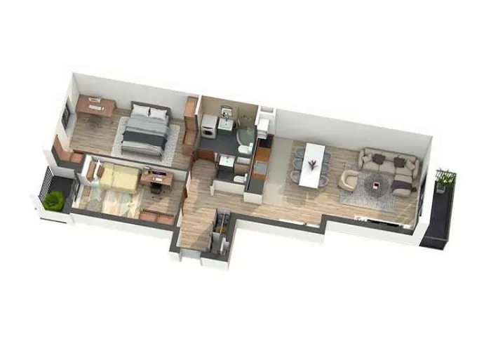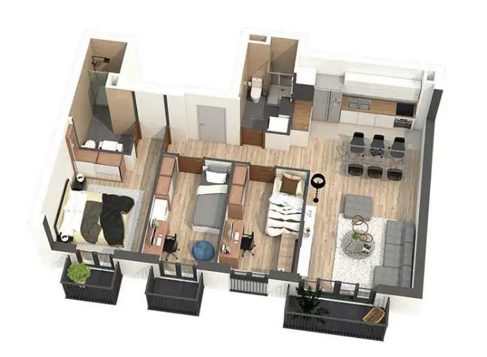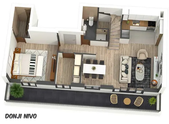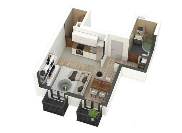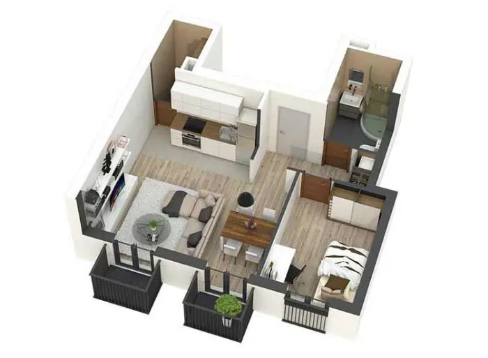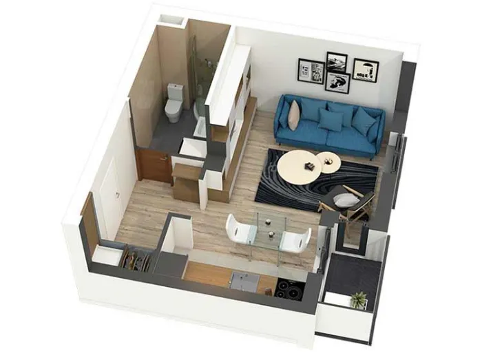 Pažljivo projektovani stanovi imaju odličnu iskorišćenost prostora, bez nepotrebnih hodnika, sa maksimalnim brojem soba u odnosu na ukupnu kvadraturu stana. Prostorije su pravilnih formi, površina srazmernih nameni kao i među sobom, gde veći broj spavaćih soba prati i veći dnevni prostor. Dnevne prostorije suobjedinjene u jednu celinu, bez zidova. Iz dnevnog prostora se pristupa tarasi.Objekat ima mali broj stanova, ali različitih struktura i kvadrature, tako da kupac može datu ponudu uskladiti prema svojim željama i mogućnostima. Po strukturi su stanovi pretežno jednoiposobni i troiposobni, od 30-140m². Poslednje dve etaže projektovane su kao kaskadni povučeni spratovi sa dupleksima od 140 i 120m2.